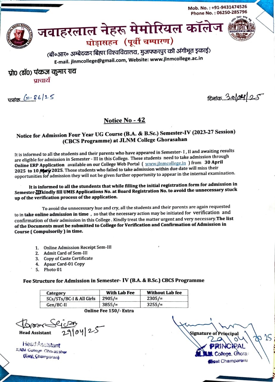 UG Science Admission Semester-IV (UG Session : 2023-27)